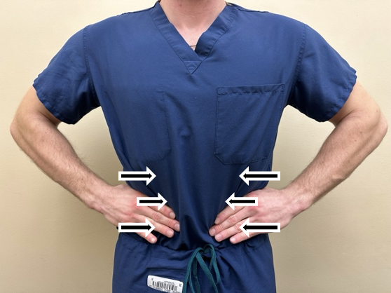 3. As you exhale, contract your abdominal muscles as if you are ready to take a punch. It may help to put your hands on your waist and feel your abdominal contraction push your hands away as seen below. I wrote this right after a shift so excuse the scrubs.